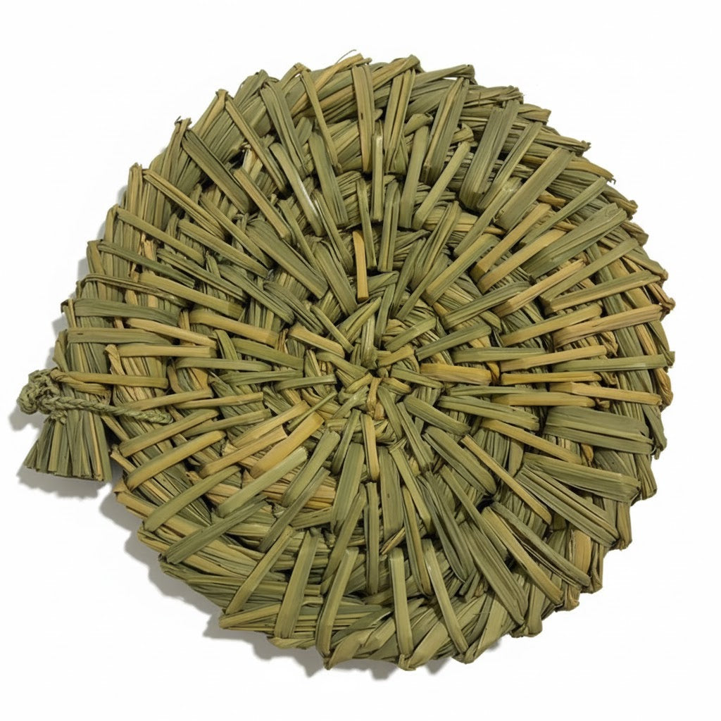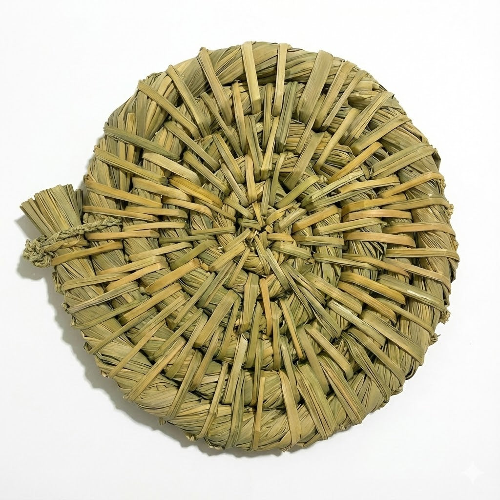 選別・茎のばらし作業・太さごとの仕分けを経て、丁寧に編み込んだこの円座には、自然への敬愛の氣持ちが込められています。